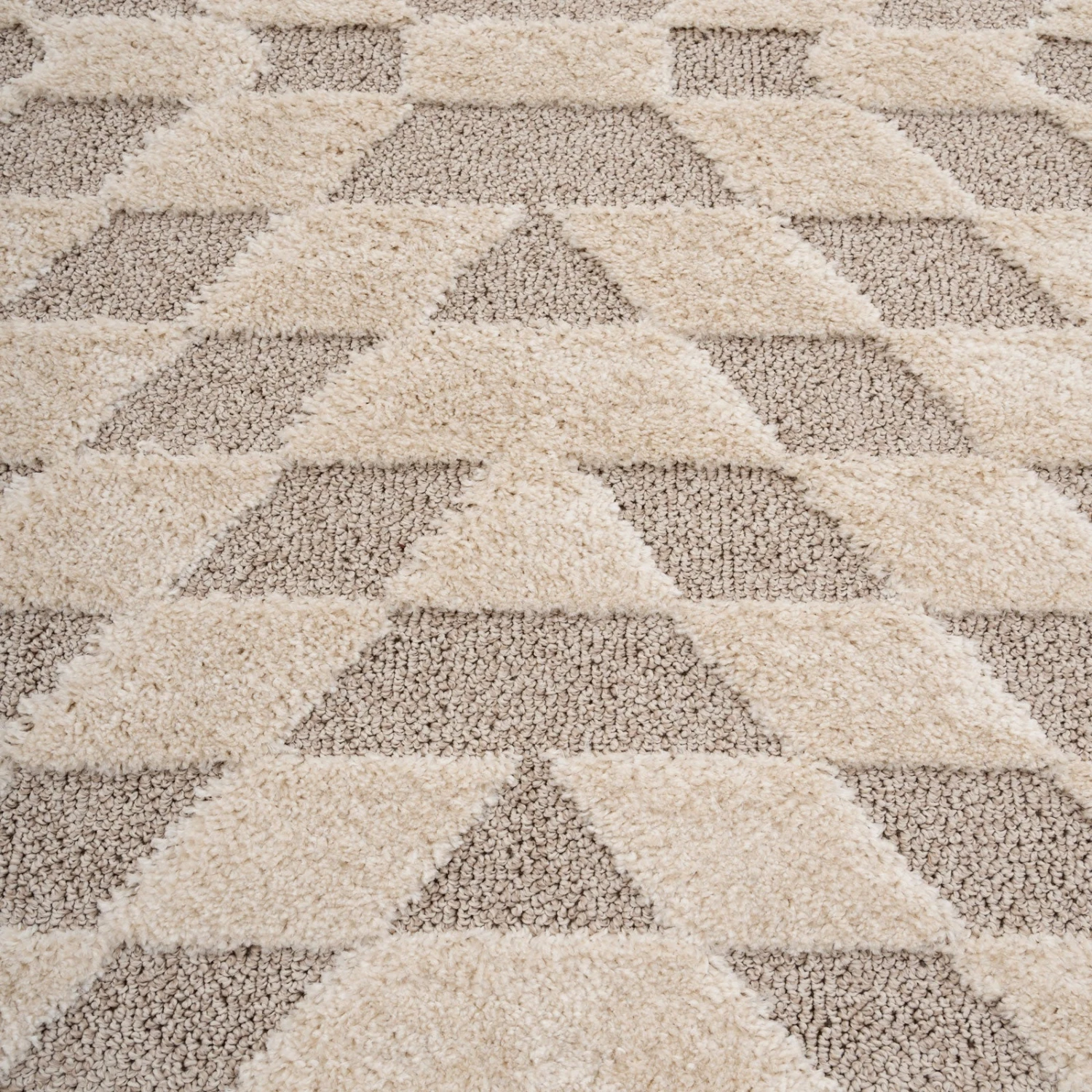 Bring bohemian flair and clean geometrics to your space with this beautiful hi-lo looped pile rug. The perfect combination of beige and white in an intriguing rhombic pattern will add a unique, eye-catching touch that will spruce up any room. Get ready to get compliments!