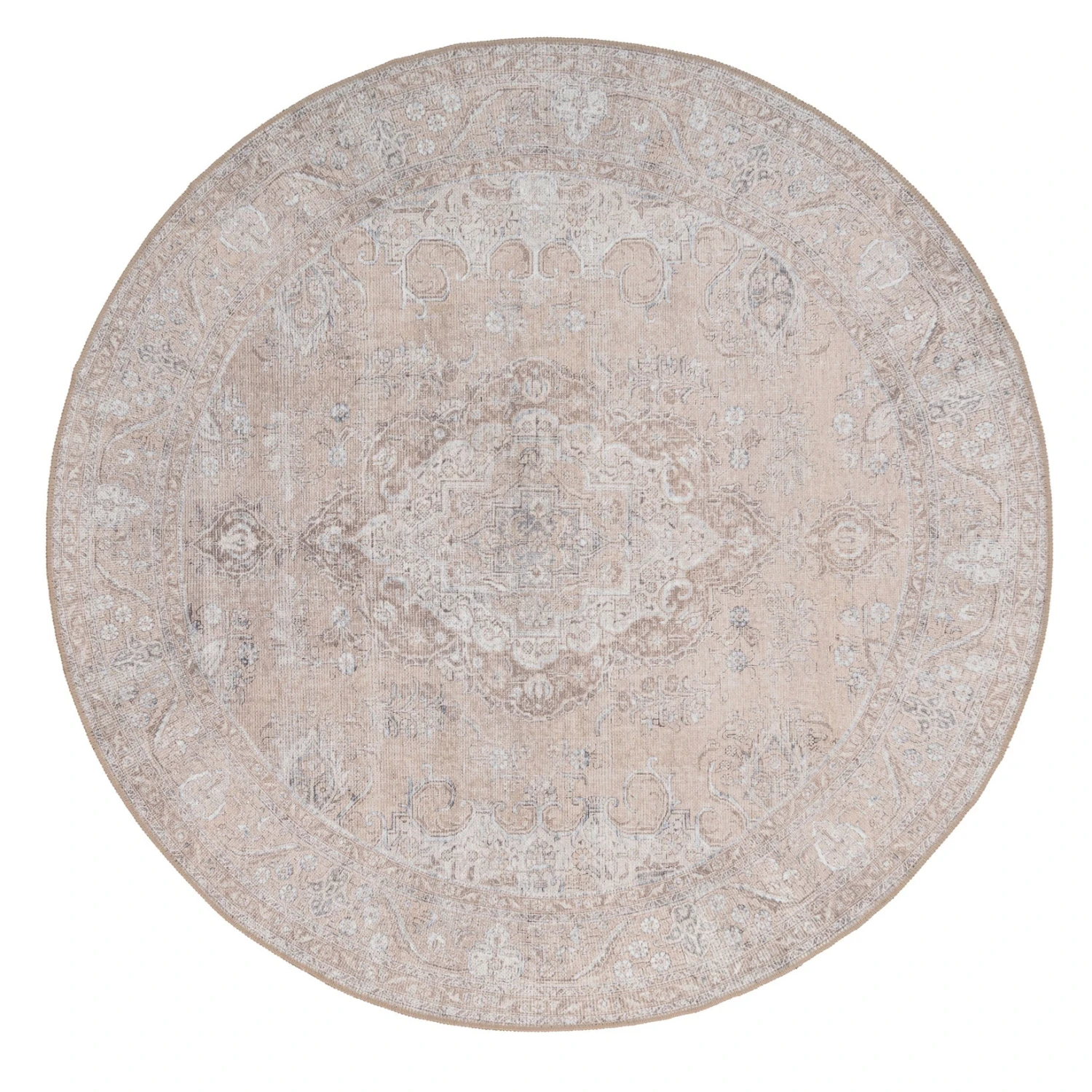 Discover the beauty of Zoe, a Traditional Beige Washable Circle Rug. Owing to its intricate detailing, it offers a timeless, elegant silhouette. The French Renaissance-inspired palette of soothing neutral tones speak to the soul and bring cherished antiques of the past to the present.