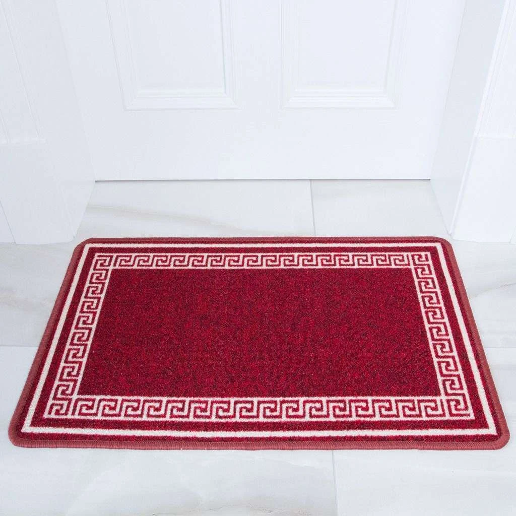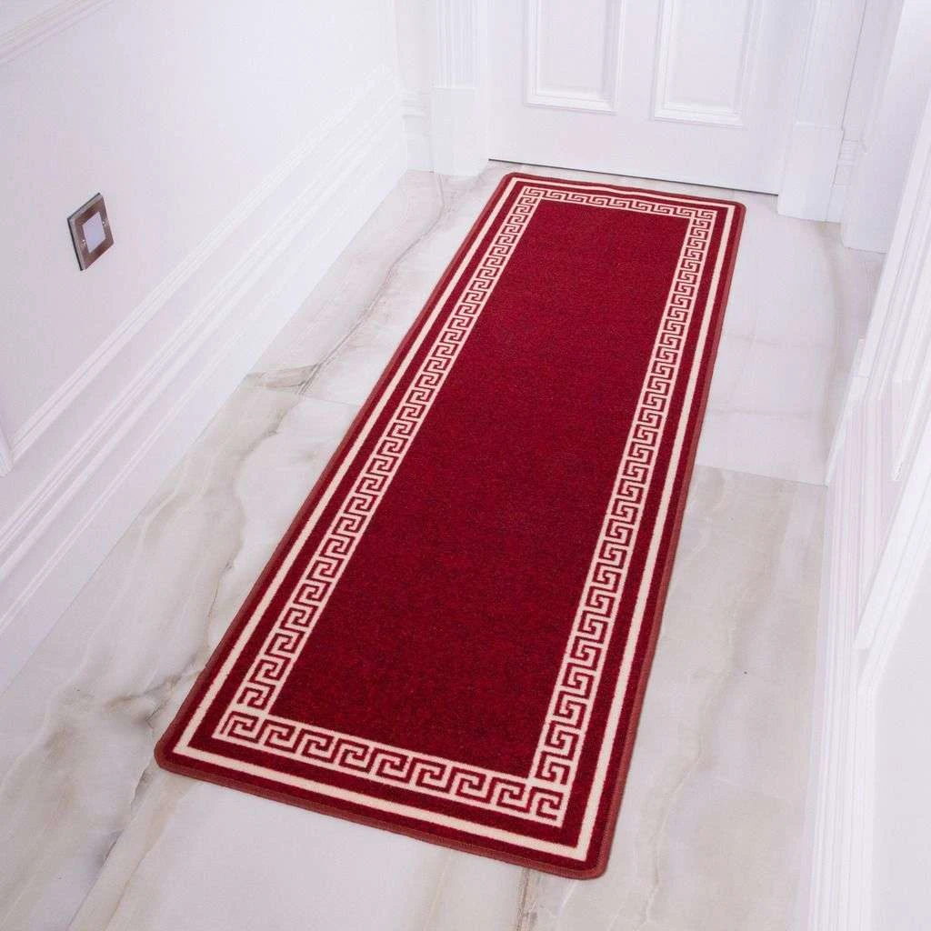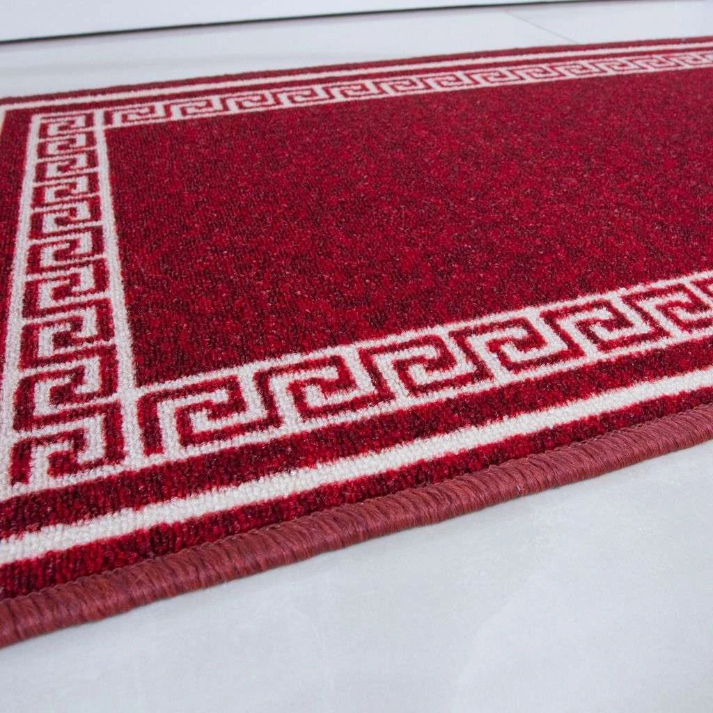 A vibrant red rug with a contrasting cream design. This modern rug will freshen up your home or business at a low cost as it features a trendy border with non-slip latex backing which is convenient for any floor with high traffic.