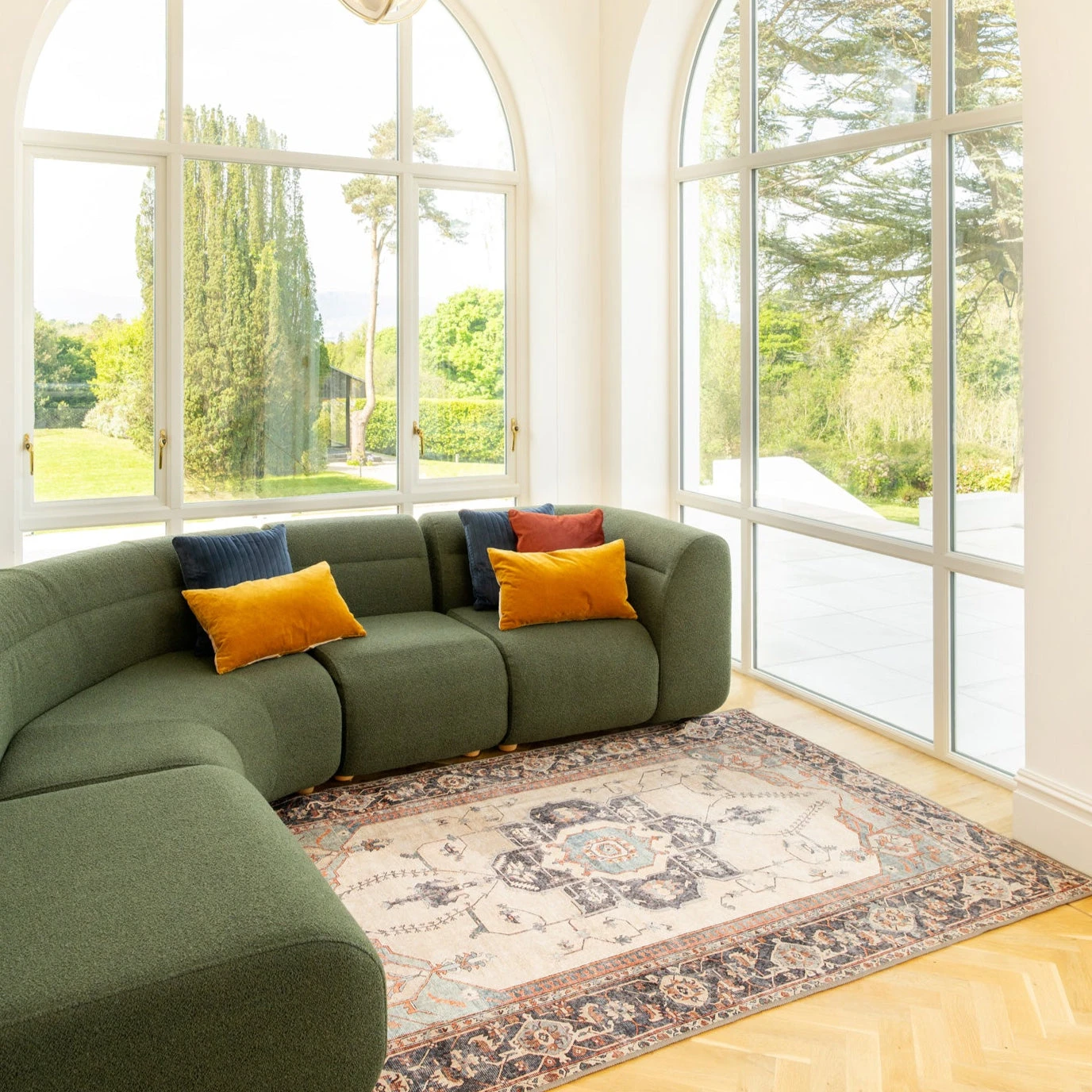 Hazel is the essence of quiet grace, soft, feminine, and effortlessly elegant, yet strong enough to stand the test of time. Inspired by Tabriz-style patterns, her intricate medallion design is woven with delicate navy and terracotta motifs, balanced by soothing blues, creams, and soft pinks for a beautifully timeworn look. This rug’s ornate, tapestry-rich border adds a touch of heritage, like a well-loved antique that has only grown more charming with age