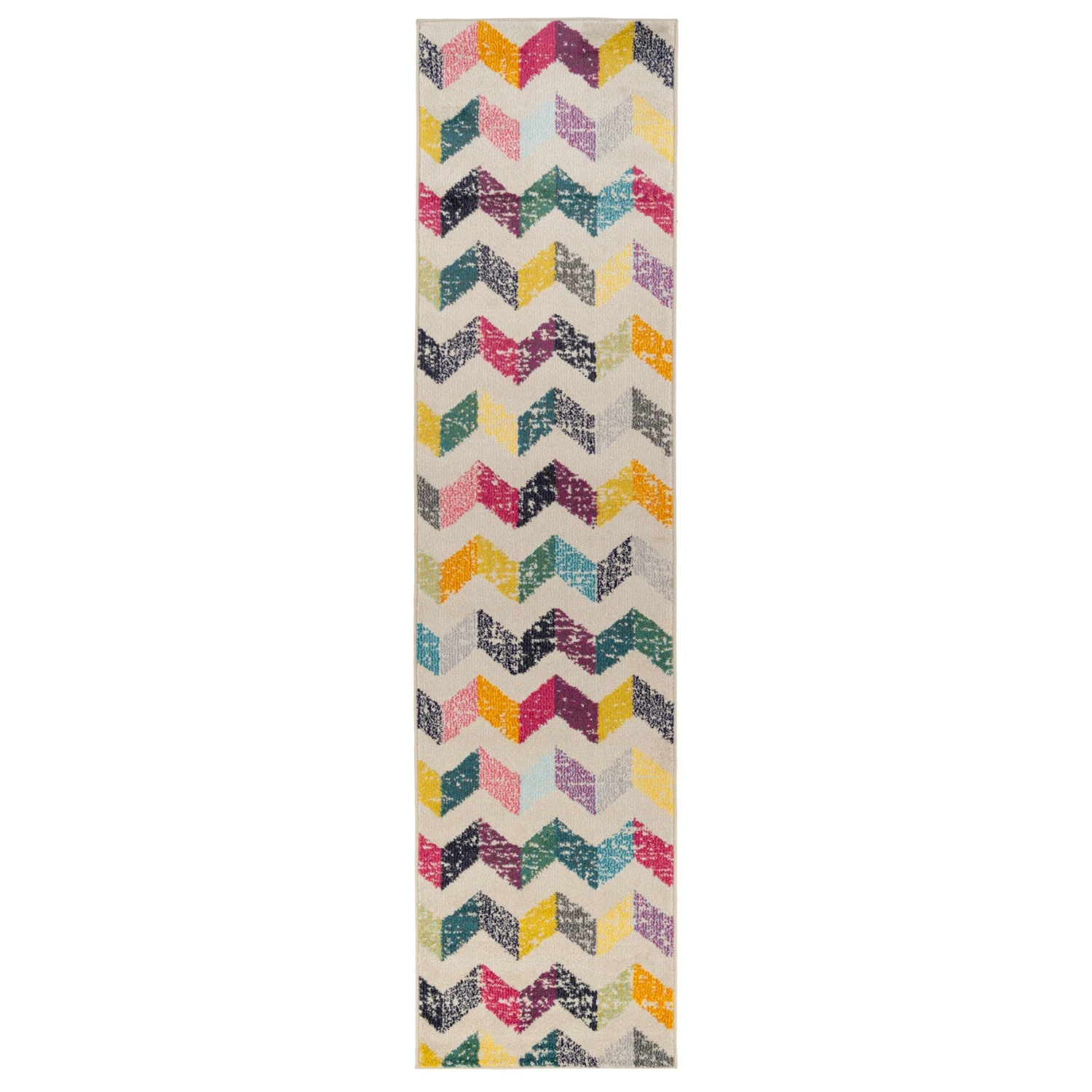 Iridian is bursting with lively and energetic pattern. A wave of bold zig zags in bright shades of magenta pink, grassy greens and soft lilacs dance across the rug.